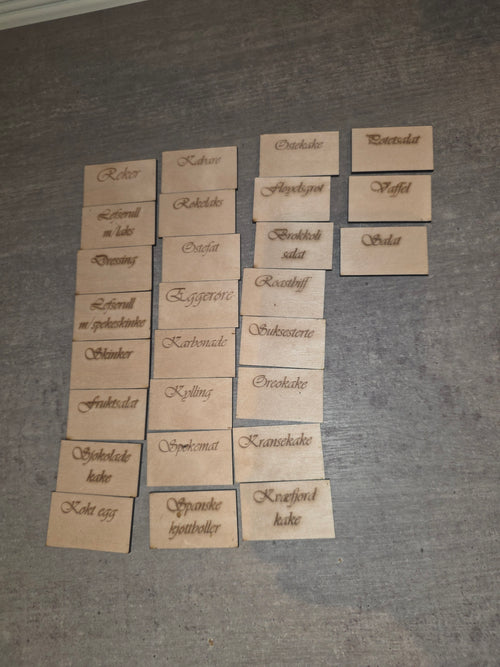Eksklusive lasergravede matskilt til buffet og selskap – perfekt til koldtbord